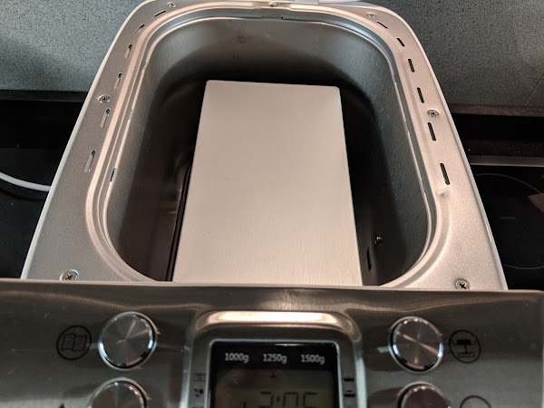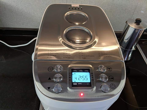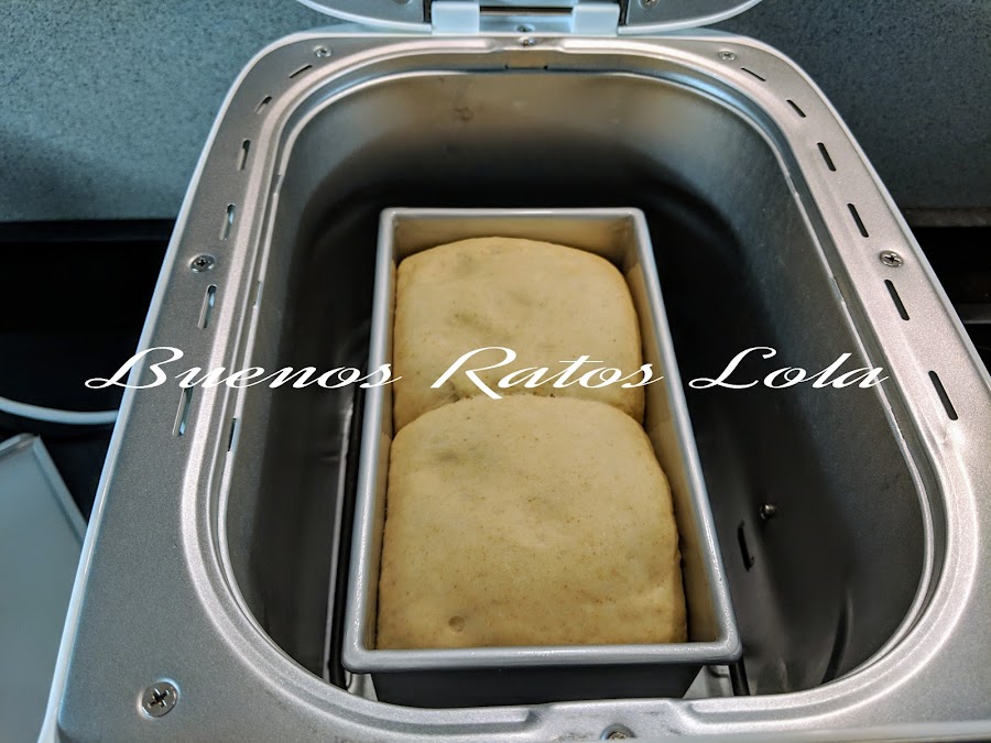 Sacamos de nuevo para cerrar la caja (pon espray también en la cara de la tapa que va a estar en contacto con la masa) y ponemos en la panificadora con cuidado de que el recipiente no toque las resistencias