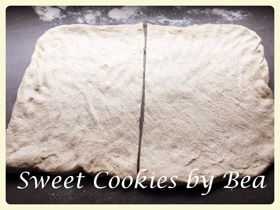 Cuando haya doblado su volumen cogemos la masa y las desgasificamos amasándola un poco, con un poco de harina sobre la mesa de trabajo, la estiramos con la mano y formamos un rectángulo el cual partiremos por la mitad, el largo será el del molde que vayamos a usar.