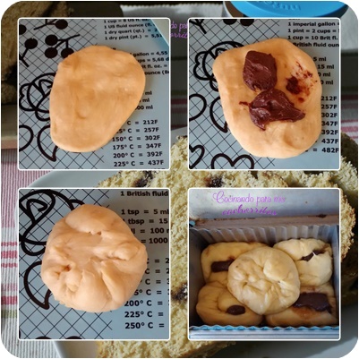 Tomamos cada una de estas partes, la estiramos con un rodillo y colocamos sobre cada una 1 cucharada sopera bien generosa de nutella. Envolvemos formando un hatillo y la colocamos en un molde para pan de molde.