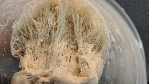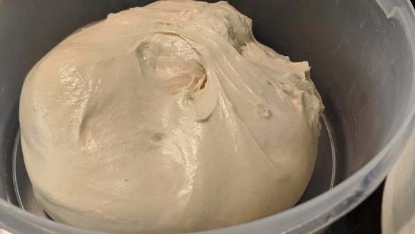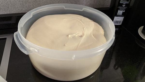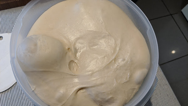 Añadimos la mantequilla poco a poco y sin dejar de amasar. Continuamos hasta sacar membrana. Ponemos en un táper y dejamos que arranque el levado a temperatura ambiente (yo tuve unas tres horas) Guardamos en la nevera
