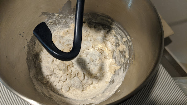 Mezclamos todos los ingredientes, menos la mantequilla, y amasamos a velocidad 1 hasta que estén bien integrados