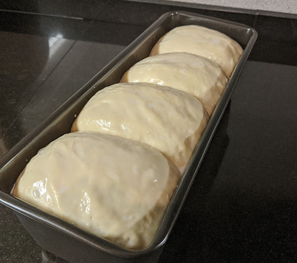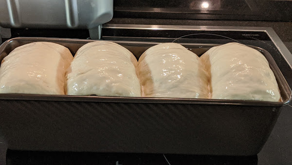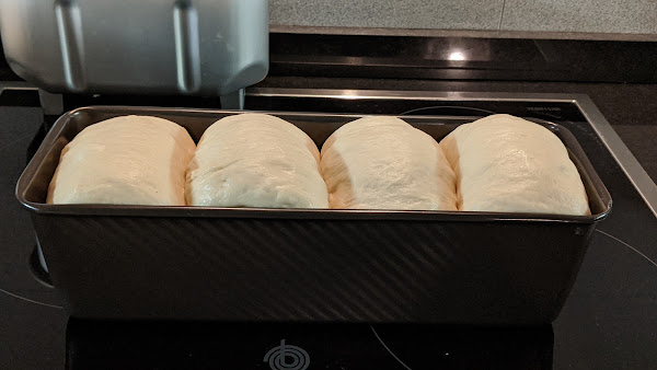 Sacamos a la superficie de trabajo, ligeramente aceitada, y dividimos en 4 porciones. Estiramos cada una de ellas, con la mano, haciendo un rectángulo. Enrollamos y colocamos en el molde. Dejamos que haga el segundo levado. Tapamos con film transparente y a temperatura ambiente hasta que la masa leve por completo. En mi caso hasta que llega al borde del molde