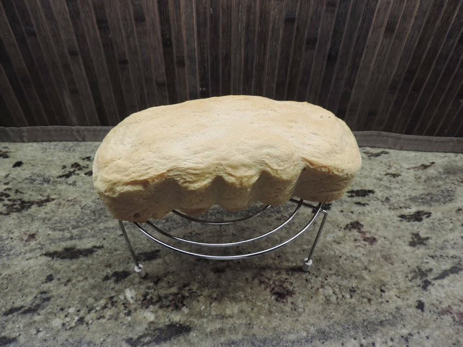 Dejamos reposar dentro del horno APAGADO para que doble el volumen y así no tenga corrientes de aire. Cuando esté sacamos la bandeja del horno donde tenemos el molde, y lo tapamos con un paño para que no se enfríe mientras se calienta el horno.