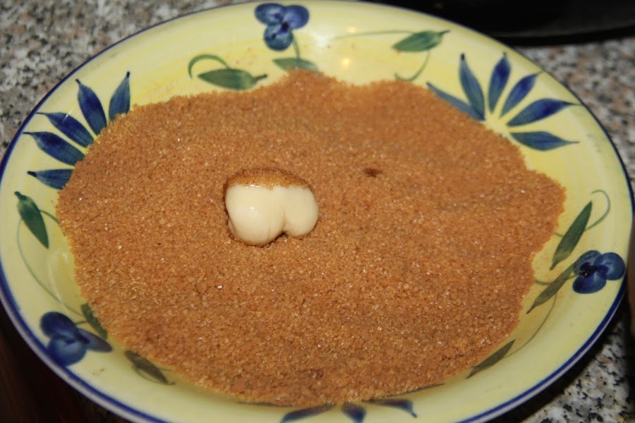 Damos forma de pelotita a cada uno de estos cuadros y los bañamos, primero, en la mantequilla derretida y, luego, en el azúcar moreno mezclado con la canela.