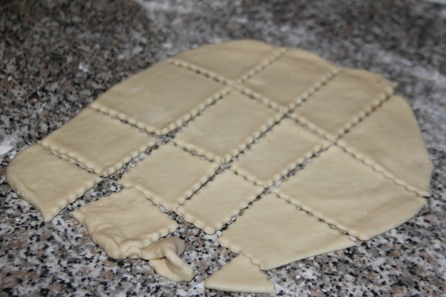 Tras este primer levado, estiramos la masa con ayuda de un rodillo y cortamos en cuadraditos pequeños.