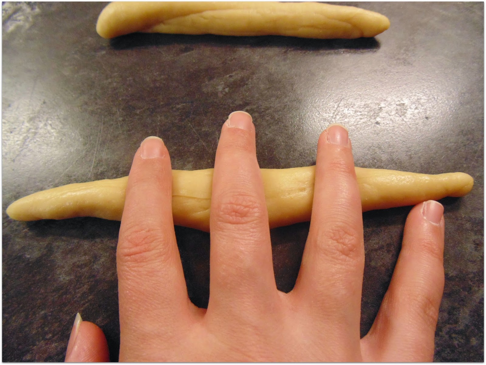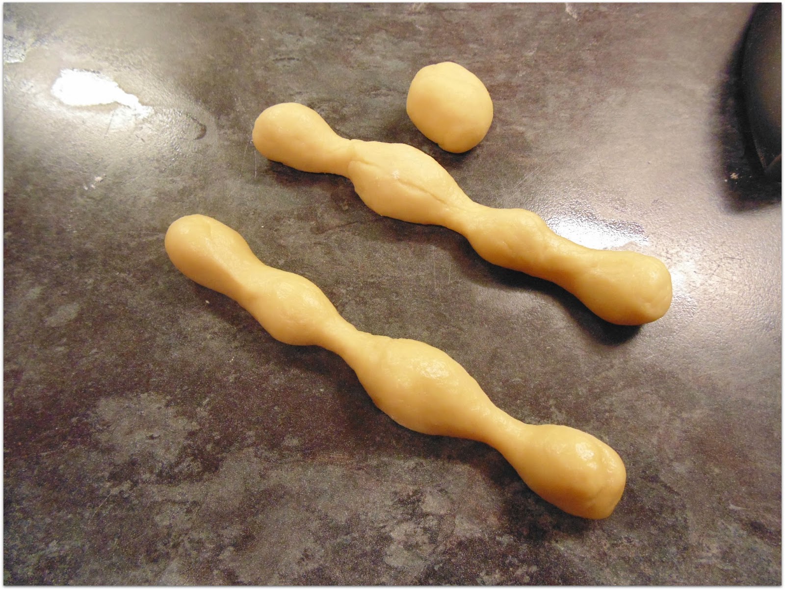 Los huesitos podéis hacerlos haciendo el típico canutillo o churro presionando con los tres dedos que véis en la foto a la vez que lo giráis. La calavera se simboliza con una bolita.