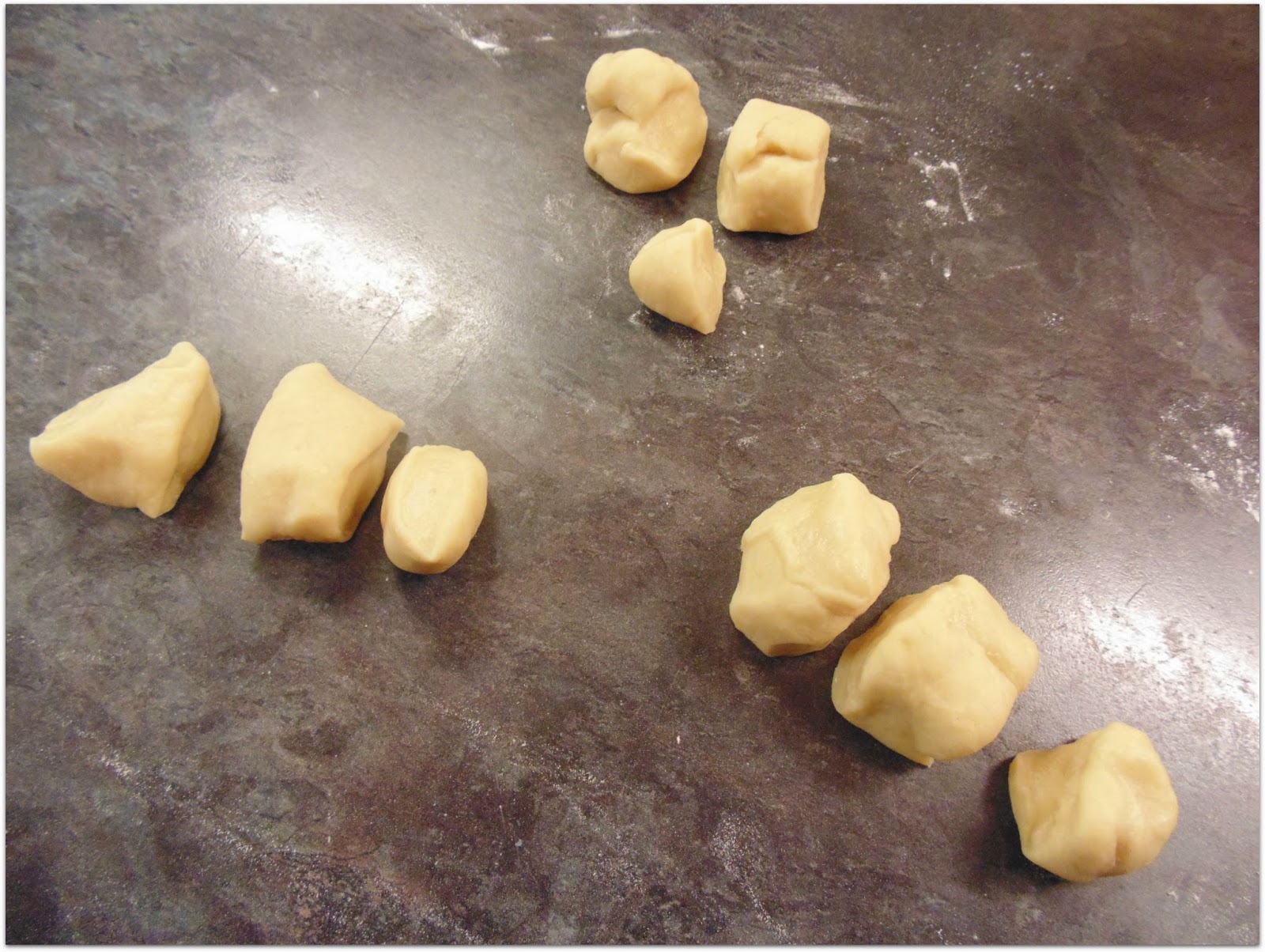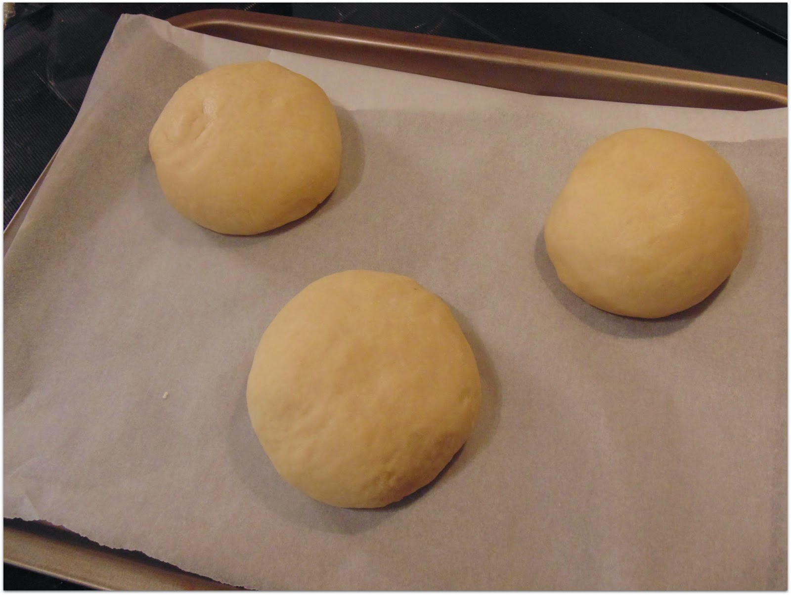 Una vez levada la sacamos de la nevera y dejamos que coja temperatura ambiente unos 45 minutos. Dividimos en cuatro partes iguales. Boleamos 3 bollitos y la última porción la destinamos a la decoración.