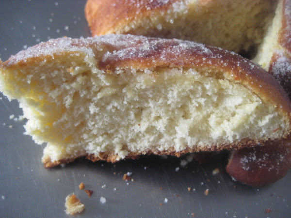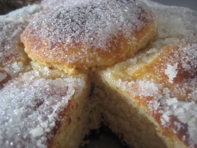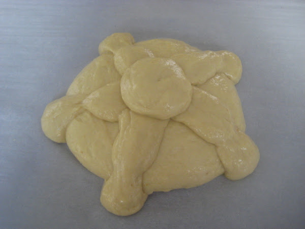 Preparación: En un bol poner las dos clases de harina, la levadura fresca desmenuzada, los huevos, el azúcar, el agua de azahar y la ralladura de limón. Amasar durante un rato y agregar seguidamente la sal. Volver a amasar y luego ir amasando mientras vamos añadiendo la margarina en pedacitos y a temperatura ambiente. Debemos amasar unos 20 minutos. Este proceso lo podemos hacer tanto a mano como a máquina. Una vez incorporada toda la margarina y bien amasada la masa la ponemos en un bol, tapamos bien y dejar reposar a temperatura ambiente durante 1 hora o hasta el día siguiente en la nevera.^Pasado el tiempo de reposo, retirar una tercera parte de la masa y con el resto formar una bola: Forrar una bandeja de horno con papel y untar con un poco de aceite de oliva. Colocar la bola de masa sobre la bandeja enaceitada. Dividir el trozo reservado en nueve partes y de esas nueve partes formar 5 bolas y 4 tiras. Colocar una de las bolas encima de la bola grande; las tiras ponerlas en forma de cruz y luego colocar cada una de las cuatro bolas en el borde del pan, entre las aspas de la cruz. Dejar fermentar el pan de muerto en un lugar cálido y húmedo (fermentadora) durante más o menos media hora. Una vez pasado este tiempo de fermentación cocer en el horno a 185-190º C durante unos 20 minutos. Los 10 primeros preferiblemente con tiro cerrado, si tenemos un horno con esa opción y luego los restantes con el tiro abierto. Una vez dorado el pan, sacar del horno, poner sobre rejilla y en caliente pincelar con la mantequilla fundida y salpicar abundantemente con el azúcar granillo. Dejar enfriar totalmente antes de consumir