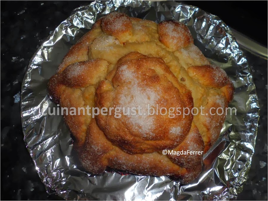 Sobre una superficie enharinada , separar 7 porciones de masa no muy grandes para formar la bola central que representa el cráneo y con las 6 restantes formar cilindros que aplastaremos un poco por el centro y extremos para formar las canillas que representan los huesos. Con el resto de la masa formar una bola y distribuir las canillas desde el centro hacia abajo. En el centro del pan colocar la bola, justo en la unión de las canillas, apretando un poco para que no se mueva. Dejar levar el pan una hora aproximadamente.