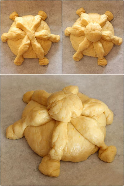 Finalmente, colocar la bolita encima de todo, donde se cruzan los churros. Volver a tapar con el papel film y dejar fermentar un poco más. El pan debe estar muy fermentado antes de meter en el horno para que no suba mucho en la cocción, ya que haría que se movieran todos los adornos.