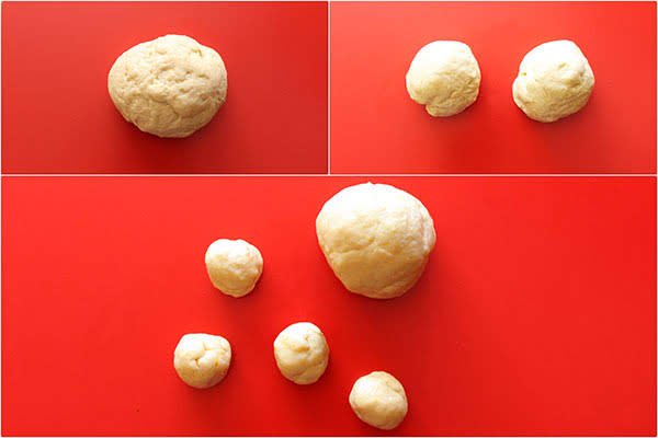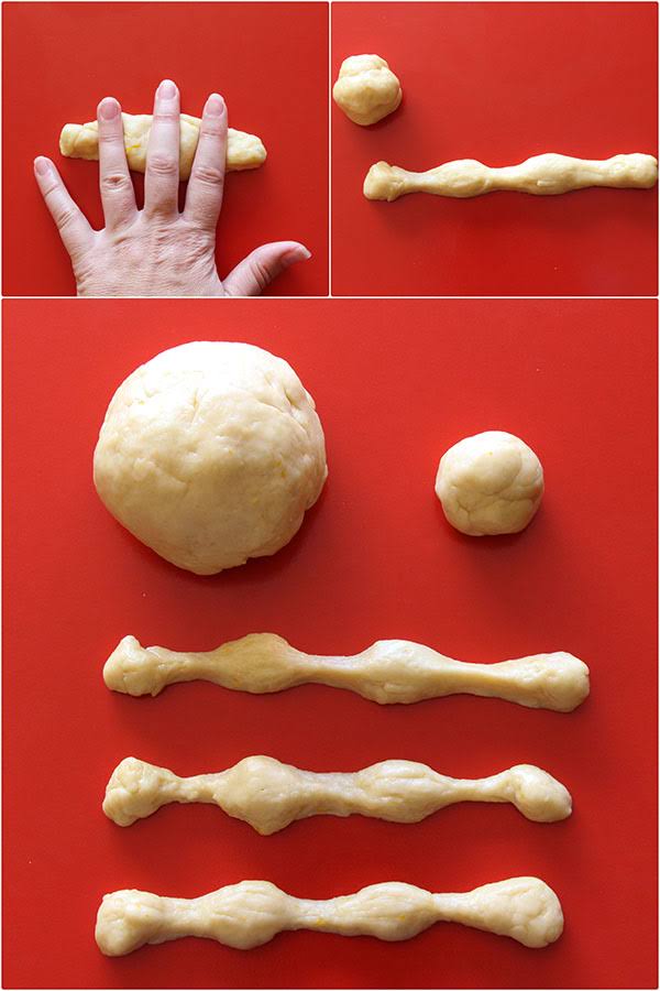 Envolver una bola y trabajar con la otra. Pesarla y tomar una tercera parte que usaremos para los adornos. Este tercio a su vez lo dividimos en cuatro partes iguales, una para la bolita y las otras 3 para los huesos que cruzan el bollo.