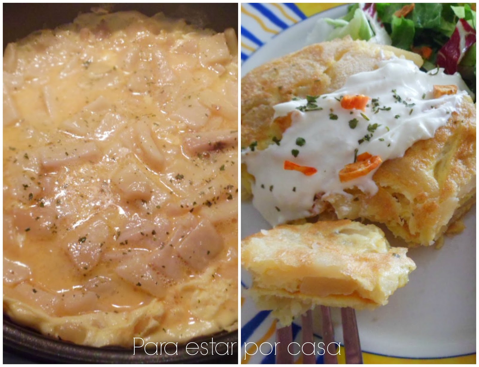 Lo único que había que hacer era ponerle unos huevos y formar la tortilla. Justo en el momento en que la tortilla se había cuajado por un lado, le añadí en el centro unas cucharadas de crema de queso de cabra, y la doblé sobre si misma para que el queso quedara en el centro. ¡Qué cosa más rica! Para repetir, seguro.