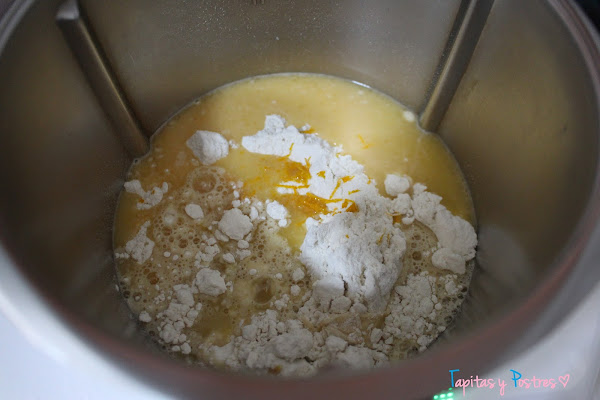 Incorporamos el zumo de naranja con la levadura. Mezclamos 30 segundos a velocidad 4.