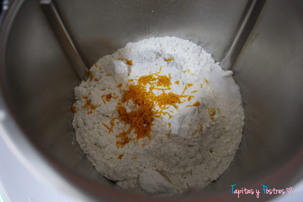 En el vaso de la thermomix o de una amasadora ponemos la harina, sal y ralladura de naranja.