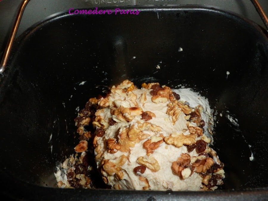 Mi panificadora emite un sonido para agregar los ingredientes más delicados y es en este momento cuando añado las nueces, las pasas y la mantequilla. Si tu panificadora no tiene esta opción añádelo cuando la masa esté bien amasada, después de unos 25 minutos.