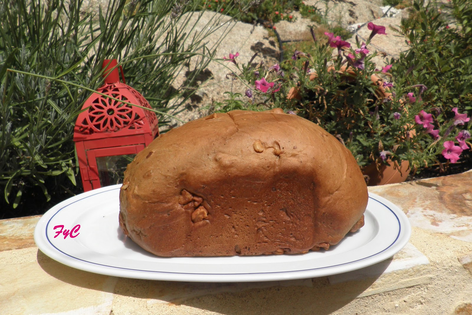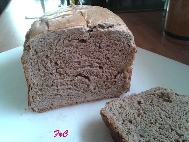 Seleccionar pan de 750 gr. programa para dulces que en mi panificadora es el 4 y tueste como os guste, en mi caso semitostado. Cuando la maquina pite añadir las nueces y dejar hasta que termine el programa. Una vez finalizado sacar el pan de la cubeta y dejar en una rejilla que enfríe.