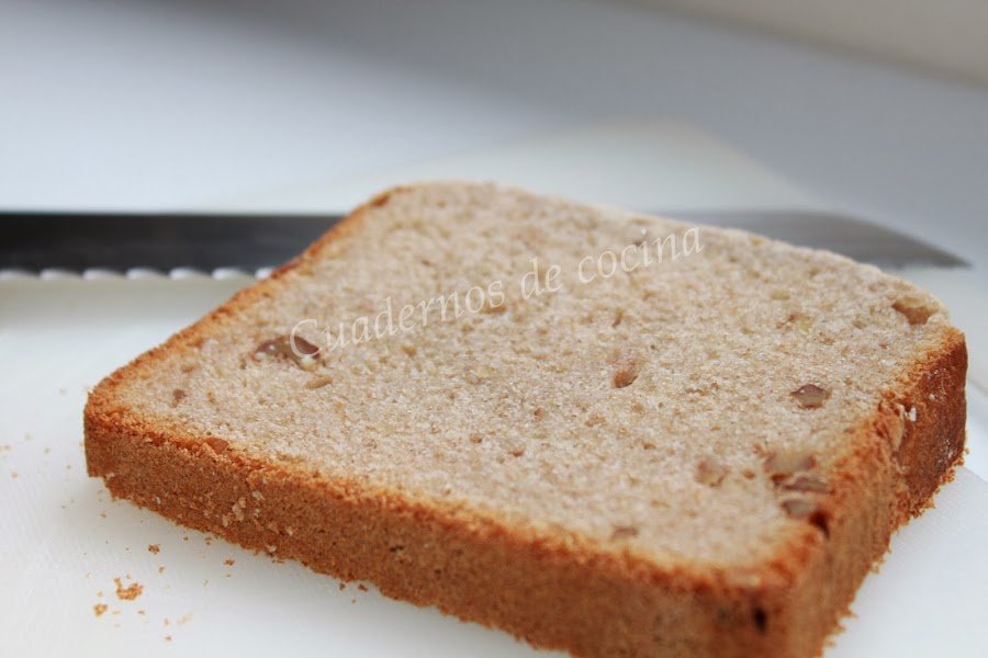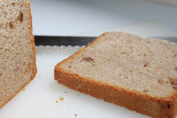 En panificadora. Colocamos todos los ingredientes en el orden mencionado en la cubeta, a excepción de las nueces. Programamos la panificadora en el programa 1, con un tueste suave y 1 kg de peso.