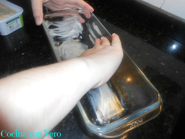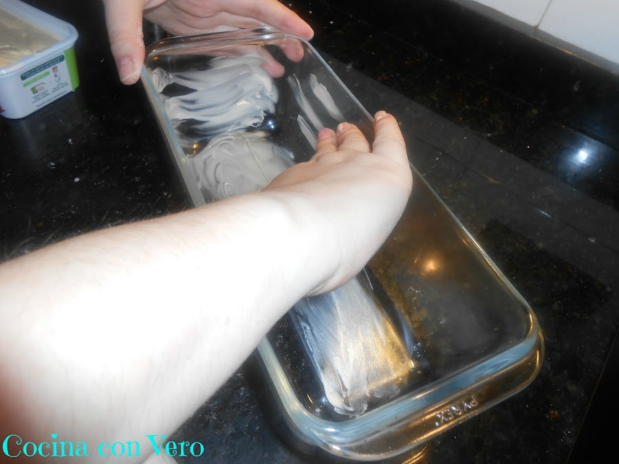 Previamente cogemos un poco de manteca con las manos para extenderla por todo el molde, especial para horno.