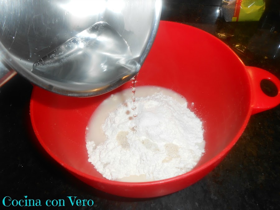 Lo revolvemos y le añadimos 50 ml. de agua templada previamente calentada en un cazo, hasta hacer una bola con ayuda de la amasadora o bien con las manos de forma que no se pegue a las manos. (Si la masa admite un poco más de agua se la echamos) ya lo vamos viendo hasta que quede una masa blanda, es decir, con elasticidad.