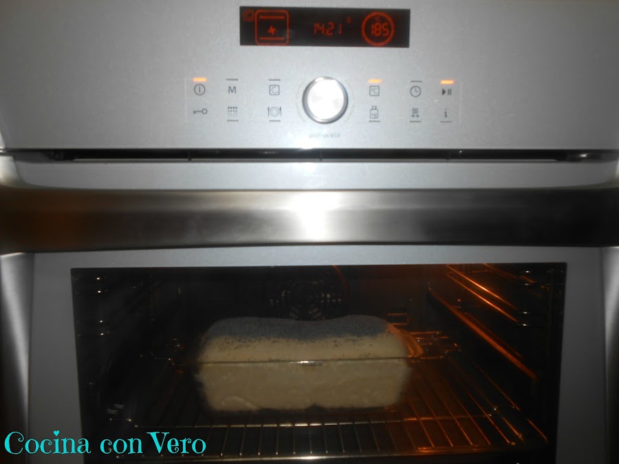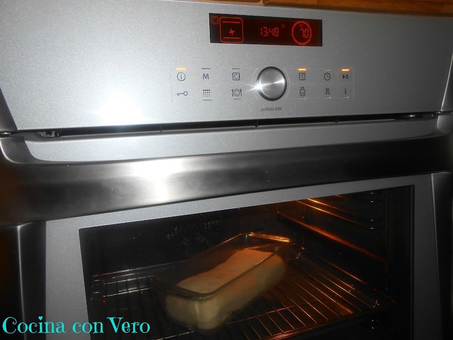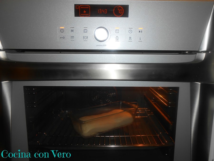4/ Metemos en el horno sin esperar a que precaliente a 70ºC y cuando alcance esa temperatura lo dejamos por espacio de 10 min. Pasado ese tiempo dejamos el horno apagado y esperamos a que suba del molde un poco.