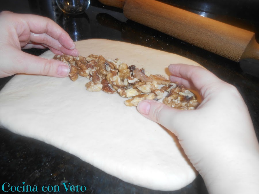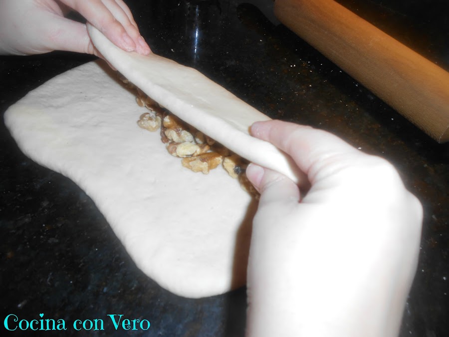 Pasamos el rodillo de madera por la masa para estirarla y formando un rectángulo o cuadrado , añadiendo las nueces en medio o bien mezclándolo todo y vamos cerrando la masa para que no salgan las nueces.