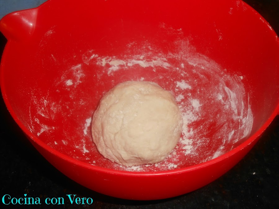 Ponemos en el bol la harina restante, es decir, los 300 gr. con la sal y le añadimos los 150 ml de agua templada previamente calentada en un cazo para hacer una bola hasta que no se pegue a las manos.