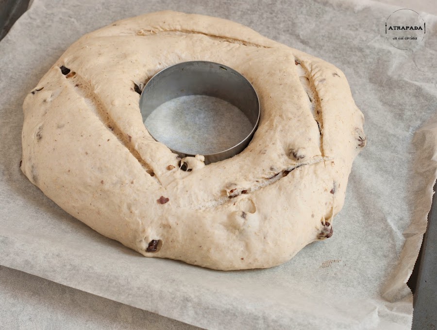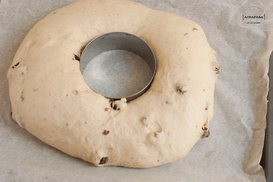 Volcamos la masa sobre la encimera aceitada y amasamos durante diez segundos. Tapamos y dejamos reposar otros diez minutos. De nuevo hacemos un amasado rápido de 10 segundos e introducimos la masa en un bol aceitado. Tapamos con un paño húmedo y dejamos levar una hora. Pasado esa hora, desgasificamos, hacemos una bola con la masa y en el centro, con la ayuda del dedo hacemos un agujero en el centro. Agrandamos el agujero, con mucho cuidado, sin romper la forma de rosca e introducimos en medio un aro de emplatar aceitado (podéis darle forma de hogaza si os es más fácil). Tapamos de nuevo y dejamos levar la rosca durante unos 45 o 60 minutos.