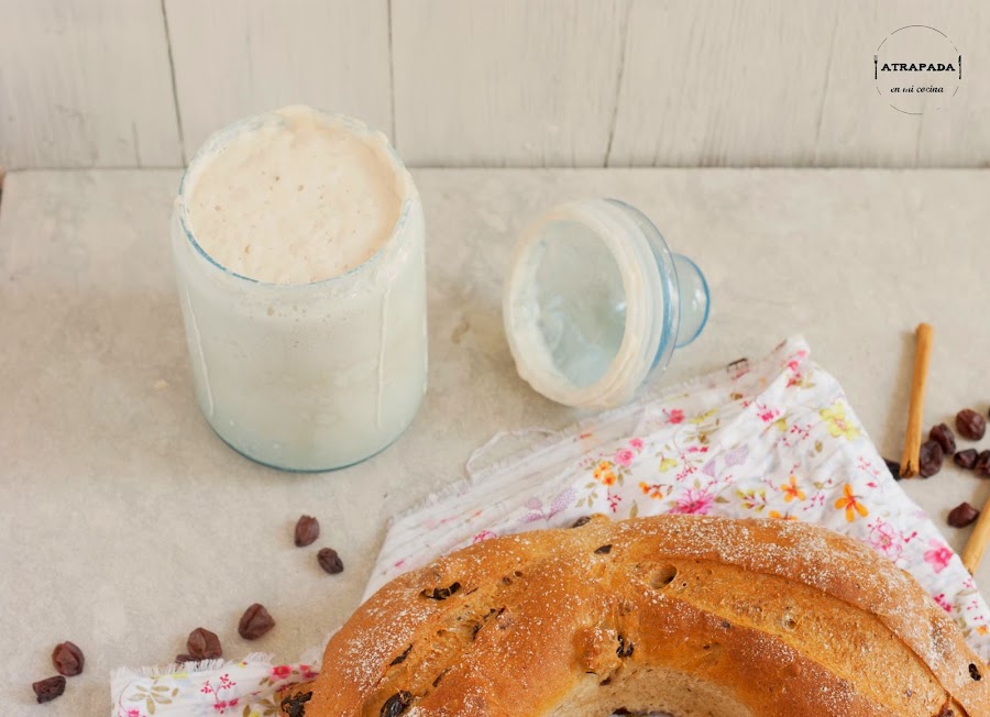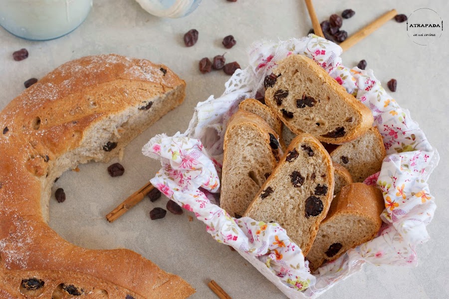 De nuevo lunes y de nuevo receta en el blog, después de un fin de semana conociendo de primera mano el Jaén más profundo, ese Jaén que enamora, conociendo la importancia del cordero segureño en la vida de los habitantes de la Sierra de Segura. Y mientras preparo el post con todos los destalles os dejo con un pan aromático que he preparado varias veces este verano, y que la última vez lo hice con masa madre, ya que de nuevo tengo una activa. La receta se la vi a mi amiga Paula, y no pude resistirme, incluso a hacerle la misma forma de rosca que ella hizo. Este tipo de panes aromáticos me encanta para untar patés caseros, pero también para tomar con tostadas de mantequilla y mermelada casera. Aunque la sorpresa es que está tan bueno que se pueden tomar las rebanadas solas, sin necesidad de acompañamiento. Las pasas que lleva el pan son compradas. Pero las que se ven en la foto son unas pasas que he tenido ocasión de secar en casa, y con las que estoy encantada.