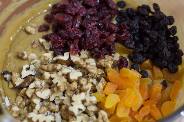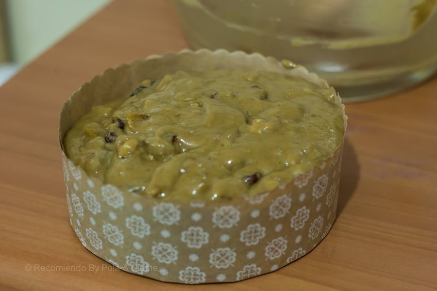 Finalmente, agregar los frutos secos y mezclar esta masa densa que tendremos, con ayuda de una espátula de cocina. Integrar todo muy bien y llevar a una cápsula para pan de pascua o molde.