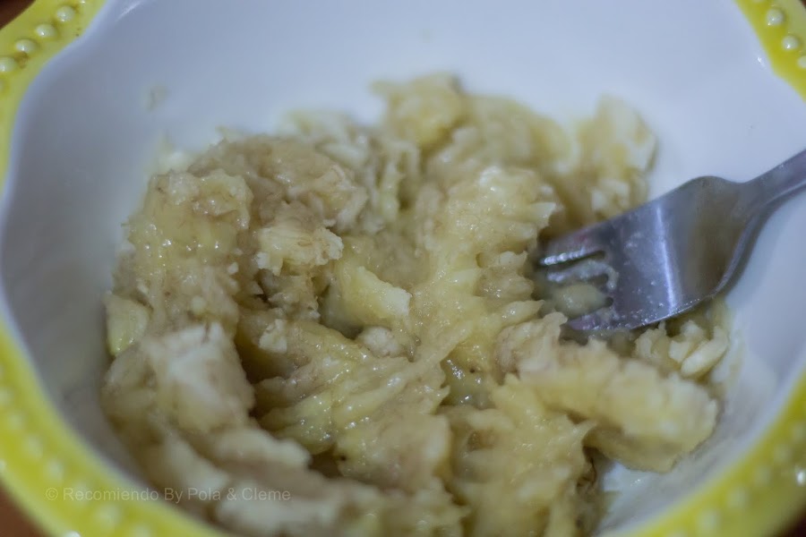 En un verter, mezclar la panela con los huevos y mezclar muy bien. Luego añadir el aceite de coco y repetir el procedimiento. Moler el plátano con ayuda de un tenedor, hasta que quede sin grupos (también puedes hacerlo en la minipimer, quedará más molido y en menos tiempo) y agregar a la mezcla anterior.