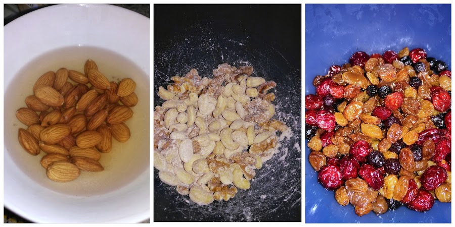 Dejar los frutos secos que elijas (yo usé almendras, nueces y castañas de cajú o anacardos) enharinados.