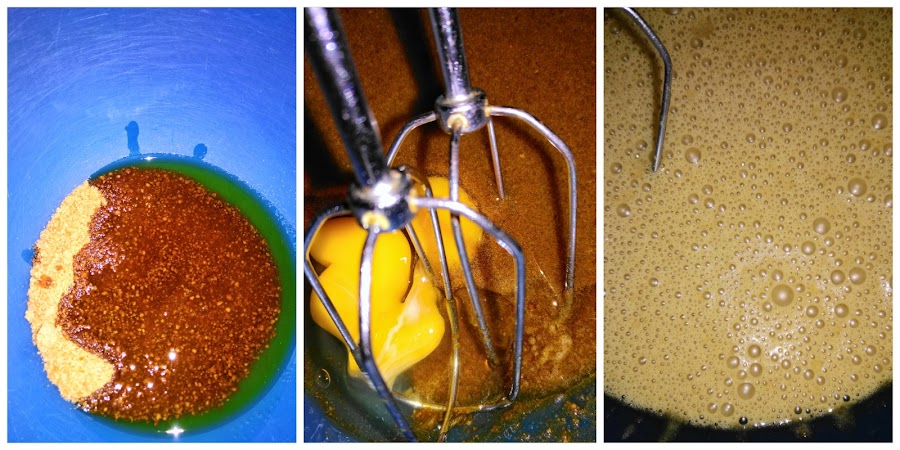 En otro bowl batir el aceite con la panela molida (o el azúcar que hayas escogido), una vez veas que el azúcar o panela esté disuelta, agrega 1 huevo y bate hasta integrar bien, luego añade el siguiente huevo e integra bien.