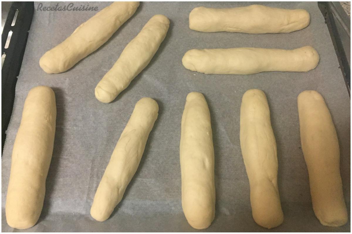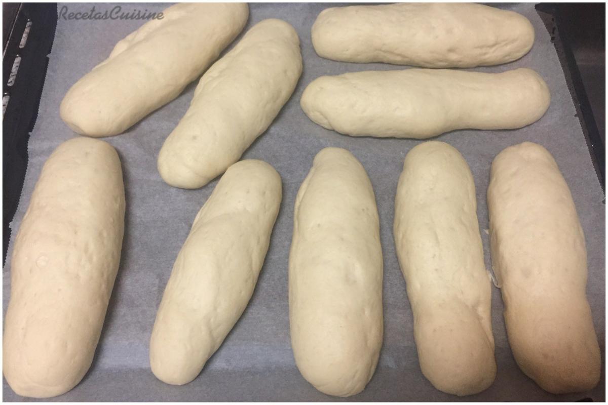5. Dividimos la masa en 9 partes lo más iguales posible. Boleamos y damos la alargada forma característica del pan de perrito.