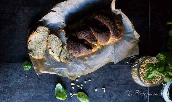 Vamos con la receta de hoy a ver si me centro de una vez. En casa cada semana hago pan, aunque ahora que estoy a dieta lo prefiero hacer con harina integral mezclada con centeno. Pero para éste que es un pan de fiesta, he preferido utilizar la masa del pan de trenza que queda genial combinada con la salsa pesto. Pero bueno, la que más os guste a vosotros, si tenéis una receta de pan que os encante, no dudéis es utilizarla por favor. En cuanto a la salsa pesto yo he hecho la clásica, pero una hecha con nueces, queso manchego y unos tomates secos quedaría de lujo total. Para gustos colores, ser libres a la hora de elegir vuestros ingredientes, aquí lo que importa es que realicéis la receta y que disfrutéis como nadie degustándola.