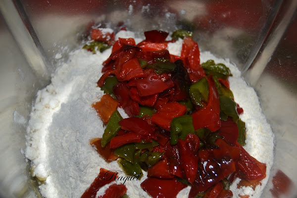 Añadimos los dos tipos de harina, el azúcar, la sal, el aceite y los pimientos triturados pero que se noten un poco, mezclamos hasta formar una masa, yo lo hice con la Thermomix 15 segundos a velocidad 6.