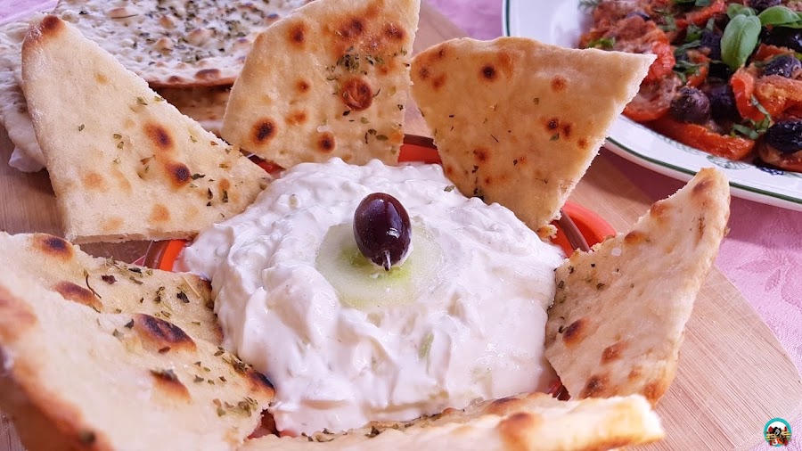 Pan de pita griego,elaboración:1.- Ponemos todos los ingredientes en un bol. Lo mezclamos bien con una cuchara de madera. Luego, la amasamos con las manos entadas en aceite. Volcamos la masa en una encimera cubierta de harina y le damos forma de bola. Dejamos reposar la masa tapa en un lugar seco durante 1 hora.