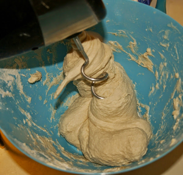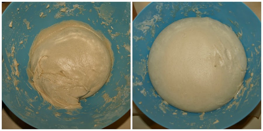 - Pasado el tiempo, ponemos en otro bol la harina, la sal, el aceite y la levadura. Comenzamos a mezclar, con la ayuda de las varillas, añadiendo poco a poco agua y sin dejar de amasar. No os pongo cantidad de agua. La que vaya pidiendo hasta obtener una masa firme y elástica, algo pegajosa pero tampoco mucho. Parecida un poco a un chicle.