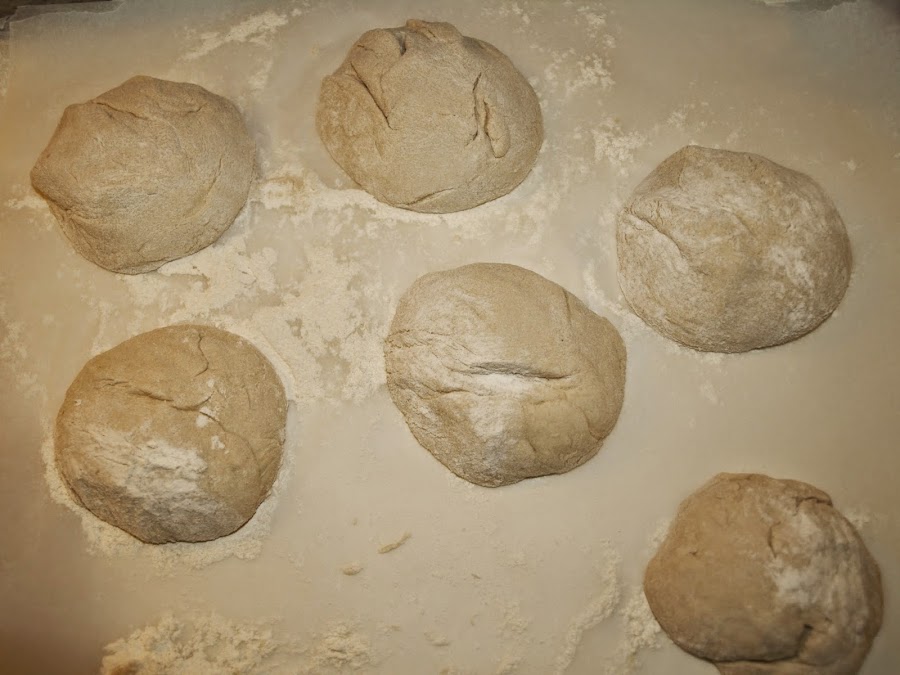 - Cuando la masa haya crecido, la degasificamos, le quitamos el aire, trabajándola un poco con las manos y formamos bolas. Las bolas deben ser compactas. Es importante para que queden bien el pan luego. Dejamos reposar 10 minutos.