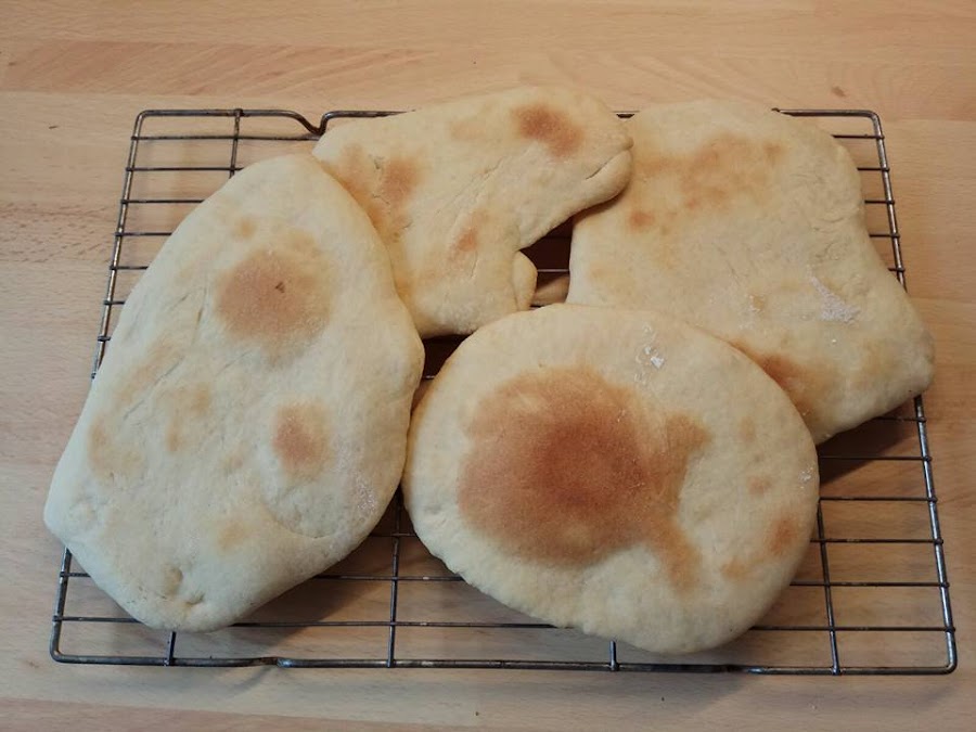 Una vez fermentada, cortamos la masa en 8 porciones iguales y formamos bolas uniformes. Las colocamos sobre una bandeja de horno y las dejamos fermentar 10 minutos más. Cuando hayan subido, aplanamos cada bola con un rodillo (no demasiado fina), las ponemos sobre una bandeja y horneamos 5 minutos, o hasta que hayan aumentado de tamaño.