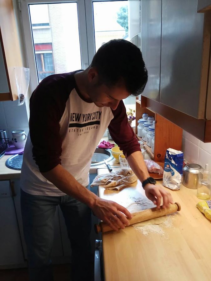 Aquí vemos a Fran aplanando el pan pita antes de ir al horno.