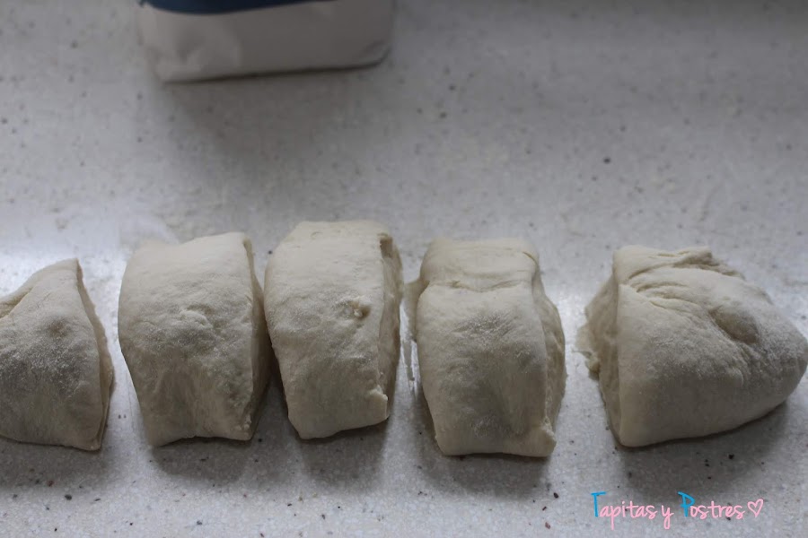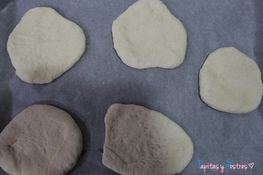 Pasada una hora mas o menos, ya habrá crecido nuestra masa. La sacamos a la encimera donde habremos puesto un poco de harina. Desgasificamos y cortamos en porciones de unos 40 gr. Estiramos dando forma redonda y colocamos sobre papel vegetal en la bandeja del horno.