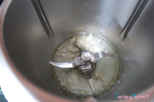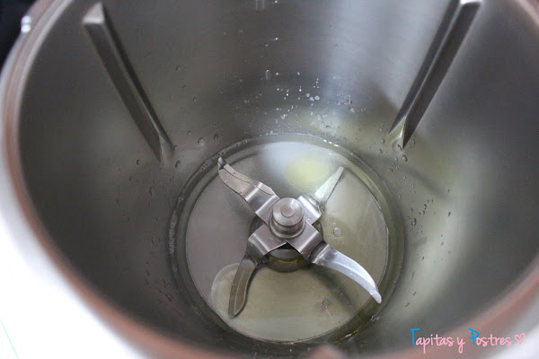 Ponemos el agua, el aceite y el azúcar en el vaso de la thermomix y calentamos 2 minutos, 37º y velocidad 1.