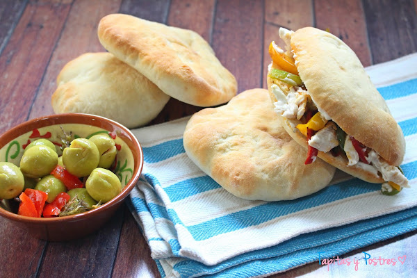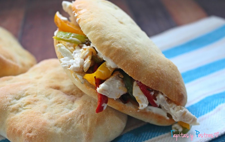 Para rellenar os doy una idea. Pochamos pimientos de tres colores (verde, rojo, amarillo) y cebolla. Salamos y dejamos que se hagan bien. Doramos una pechuga de pollo a la plancha y desmigamos. Abrimos el pan de pita, untamos con mayonesa y ponemos pollo y pimientos dentro. Así nos los hemos comido nosotros.