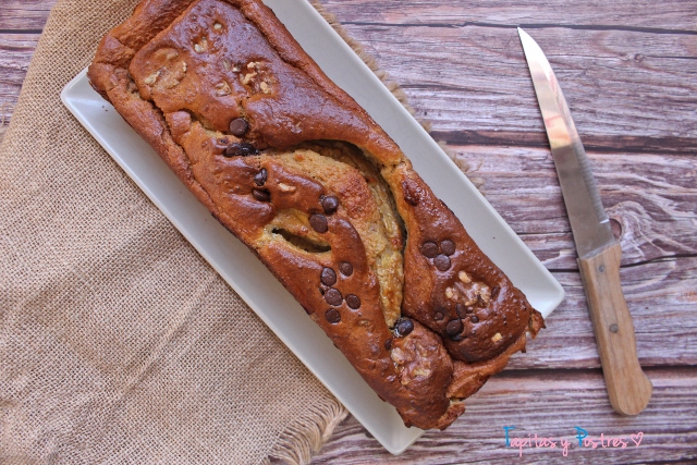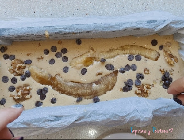 Verter la masa en un molde alargado forrado de papel vegetal. Añadir las nueces picadas las pepitas de chocolate y el plátano cortado por la mitad a lo largo. El mío estaba demasiado maduro y se hundió un poco. Hornear 45 minutos a 180º.