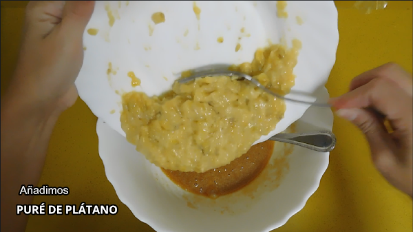 Ahora ponemos en un bol el resto de los ingredientes y cuando estén bien integrados, añadimos el puré de plátano que creamos anteriormente.