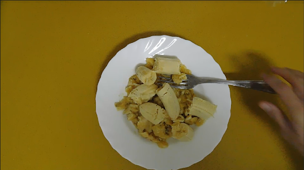 Primero pelamos y trituramos los plátanos con ayuda de un tenedor. Una vez estén todo los plátanos bien troceados los reservaremos.