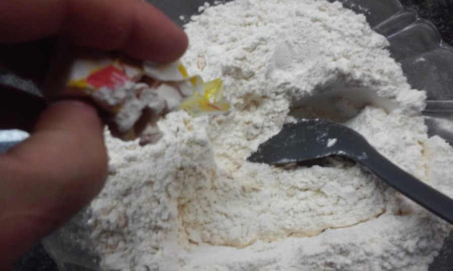 3.- Agregamos el otro paquete a la harina bien desmenuzado y removemos.