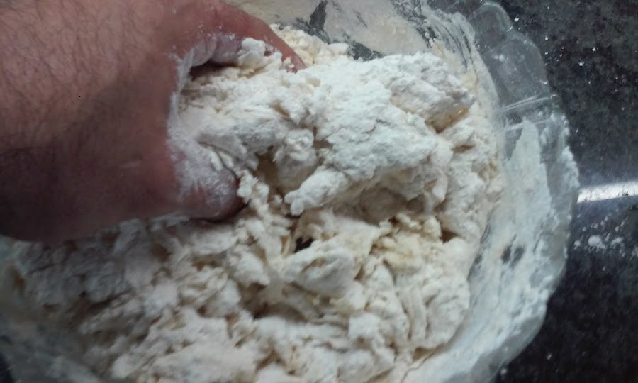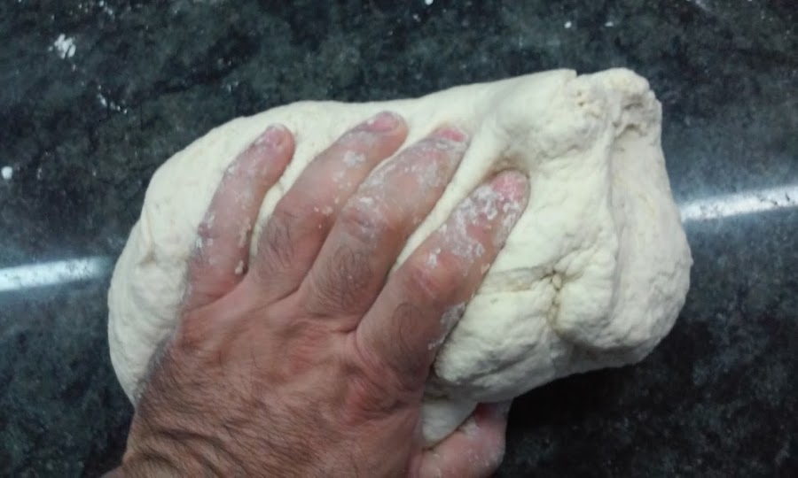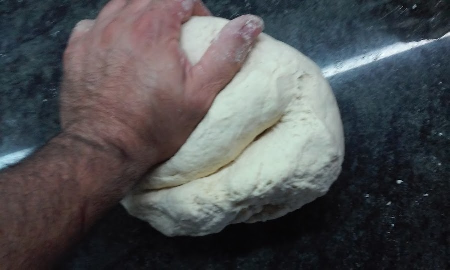 5.- Vertemos la masa sobre la encimera o tabla de amasar y vamos amasando todo unos minutos hasta que la masa quede bien mezclada y homogénea.