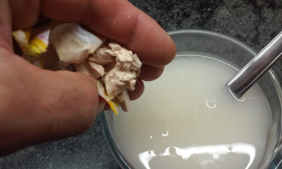 2.- Ponemos el agua tibia y disolvemos una paquetito de levadura prensada (25grs)