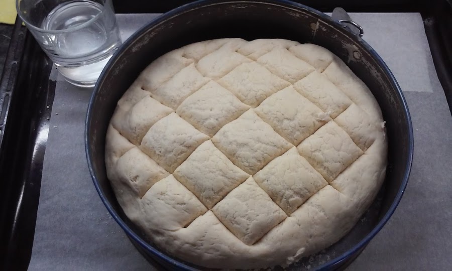 7.- La masa habrá doblado y ahora la colocamos sobre un papel de horno y damos forma realizando unos cuadros sobre la superficie. Yo le he colocado un molde para que no se extienda y suba más en una segunda fermentación que haremos con el horno a 60 grados y colocamos un vaso de agua por la mitad al lado.